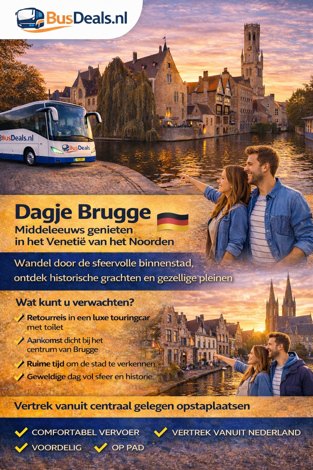 Ervaar de unieke charme van Brugge, één van de mooiste steden van Europa. Deze middeleeuwse stad staat bekend om haar sfeervolle grachten, historische gebouwen en gezellige pleinen.